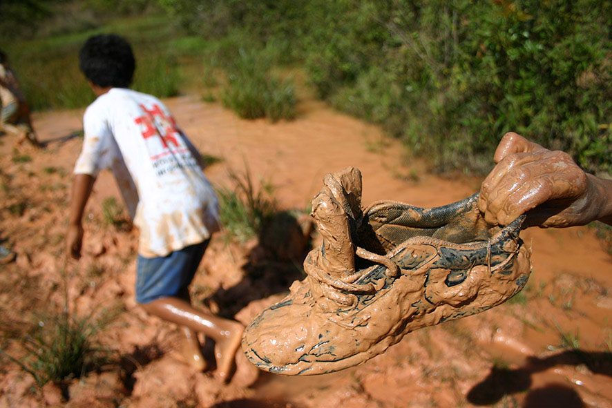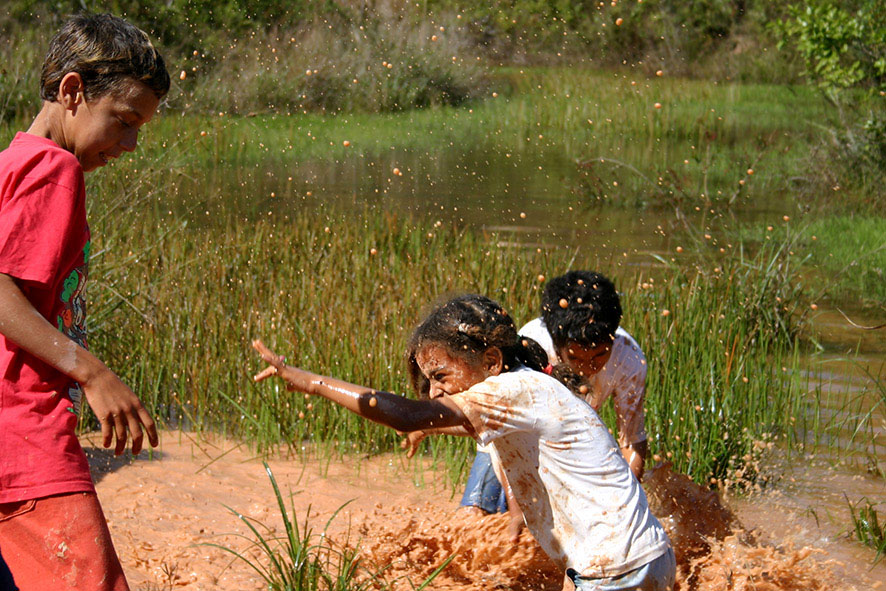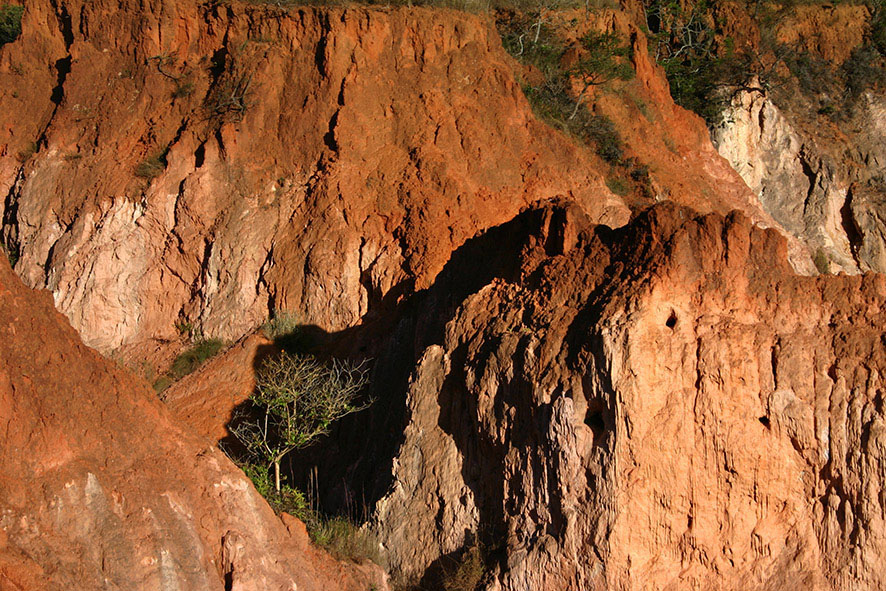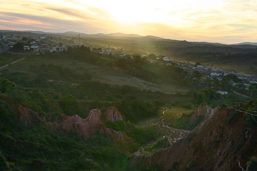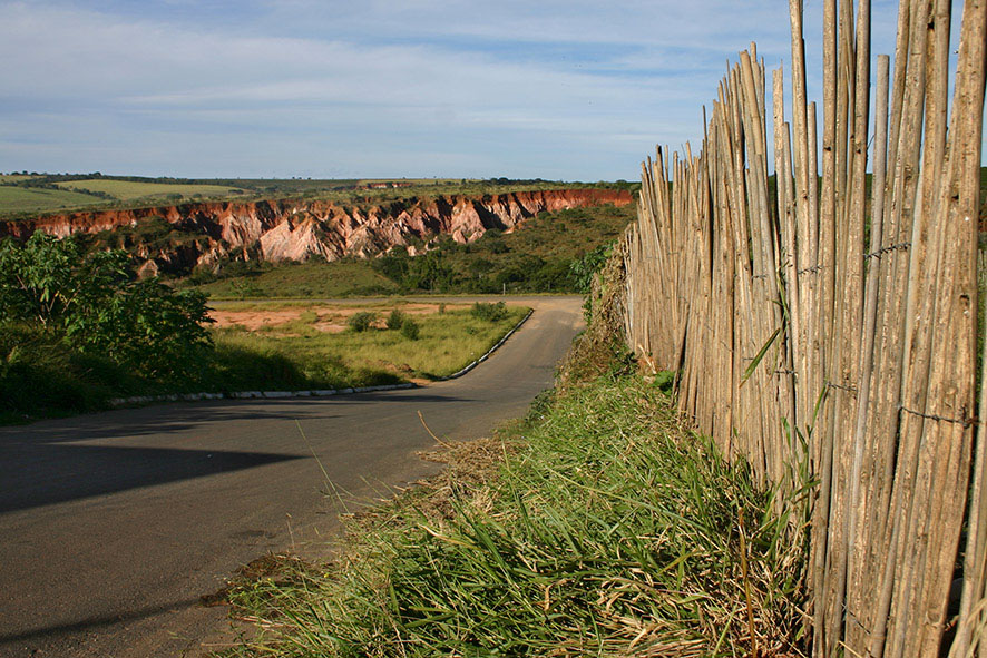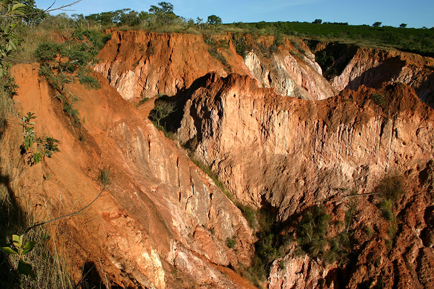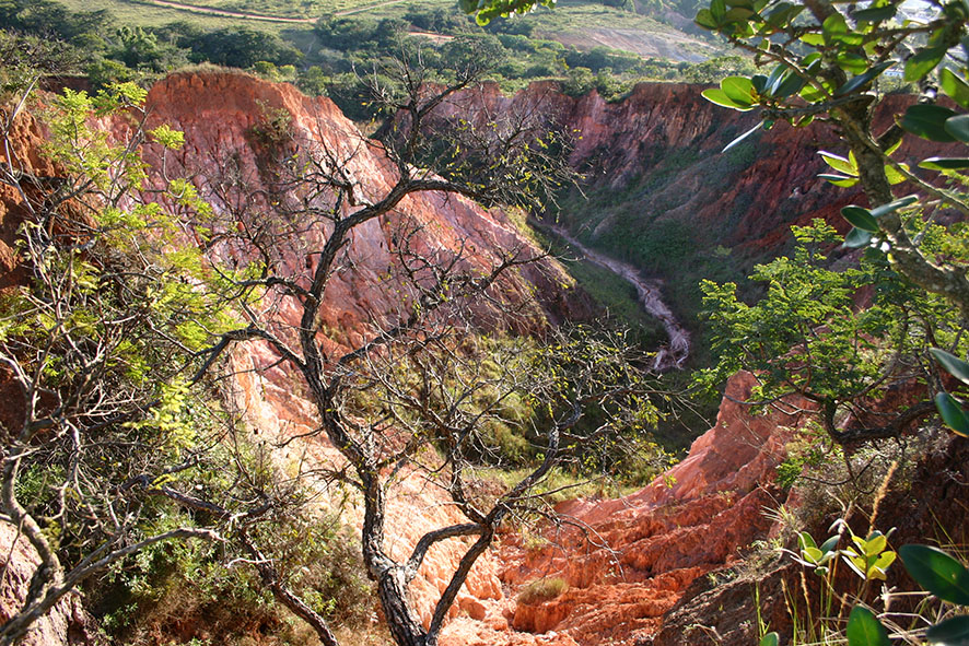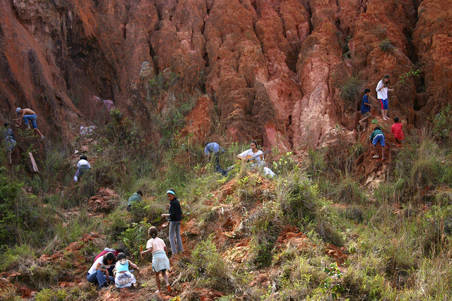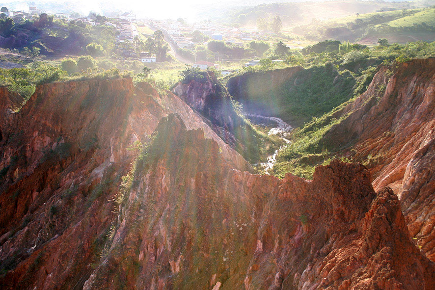 Voçorocas ferem a paisagem de vermelho. Provocadas pelo desmoronamento de terras, desnudam camadas inférteis do subsolo. Ameaçam a agricultura, as obras viárias e urbanas, assoreiam rios. Comuns em regiões onde houveram minerações, essa desoladora degradação ambiental é proveniente da ação do homem. Primeiro trabalho digital, fotografei movimentos de recuperação de uma voçoroca urbana para o projeto educativo “Maria de Barro”. O ensaio retrata um dia ensolarado de inverno passado em uma voçoroca urbana. Um grupo de crianças de uma escola do município de Nazareno aprende a conhecer e respeitar o solo, e a plantar mudas da vegetação nativa. Seus professores buscam redefinir a relação humana com a água, o solo e a sociedade.